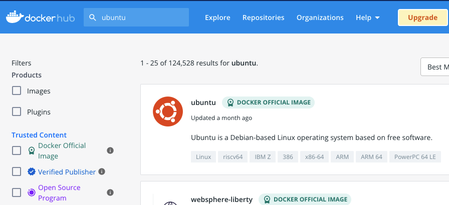 도커 허브에서 ubuntu를 검색하면 신뢰할 수 있는 콘텐츠 항목에서