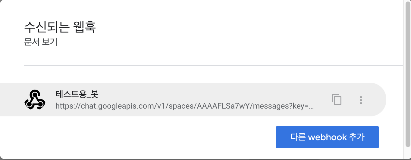 웹훅 관리를 통해서 기존에 생성된 웹훅 URL을 확인할 수 있습니다.
